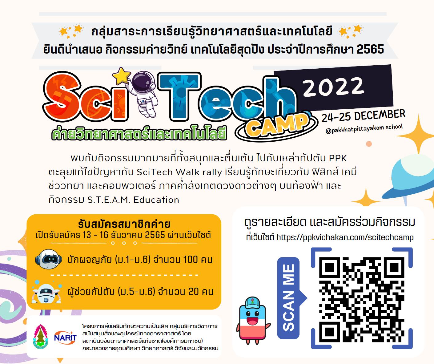 ประชาสัมพันธ์รับสมัครนักเรียนร่วมกิจกรรมค่ายวิทยาศาสตร์และเทคโนโลยี ประจำปีการศึกษา 2565 สมัครและรายละเอียดเพิ่มเติมผ่านเว็บไซต์ https://ppkvichakan.com/scitechcamp