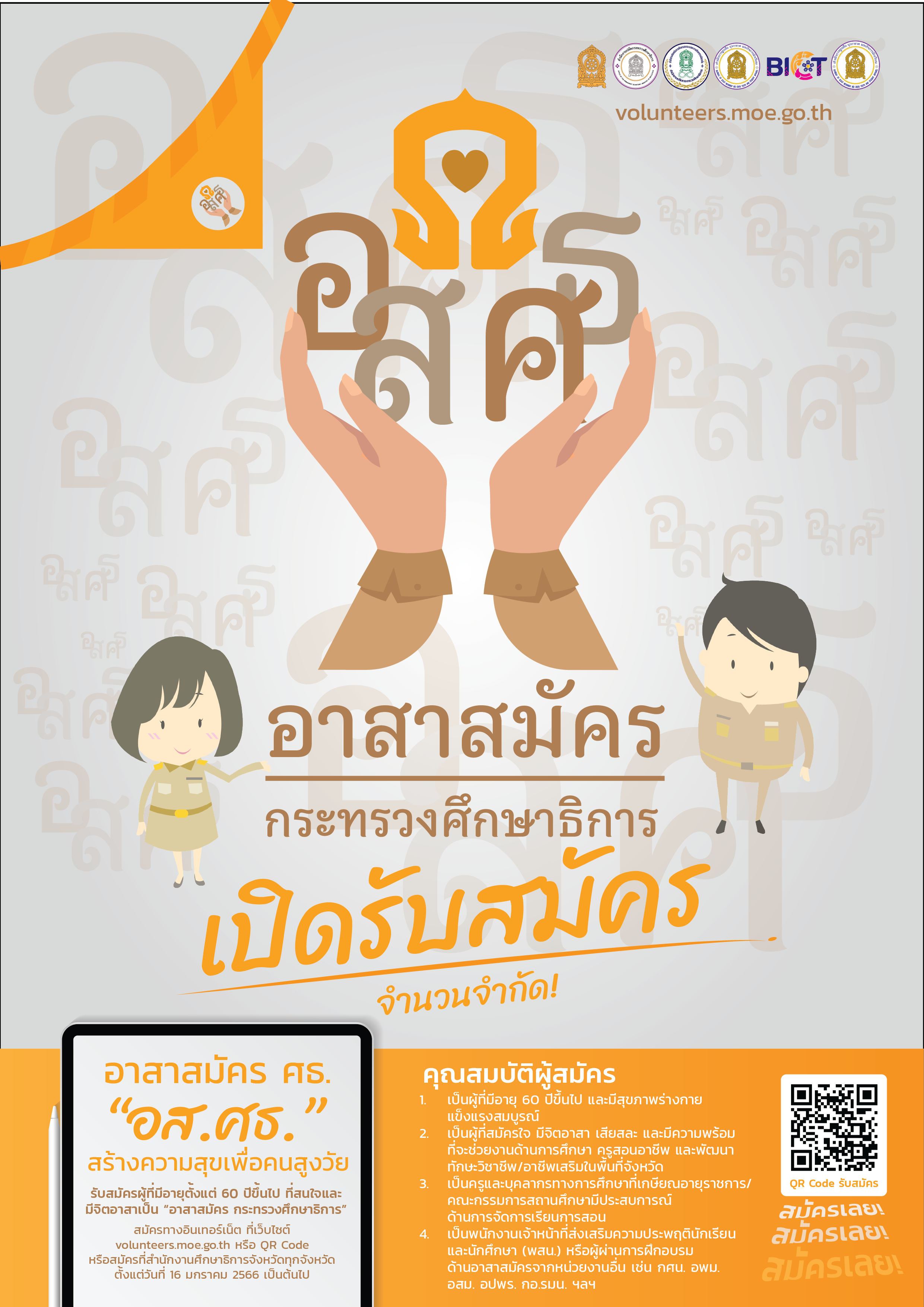 ประชาสัมพันธ์รับสมัครอาสาสมัครกระทรวงศึกษาธิการ (อส.ศธ.) หมายถึงผู้ที่อายุตั้งแต่ 60 ปีขึ้นไป ที่ประสงค์ช่วยงานด้านการศึกษา หรือผู้ที่มีความเชี่ยวชาญเป็นผู้สอนวิชาชีพ เพื่อส่งเสริมการมีงานทำและเพิ่มรายได้ให้กับผู้สูงอายุในชุมชน ศึกษารายละเอียดเพิ่มเติมที่ https://volunteers.moe.go.th/public/home