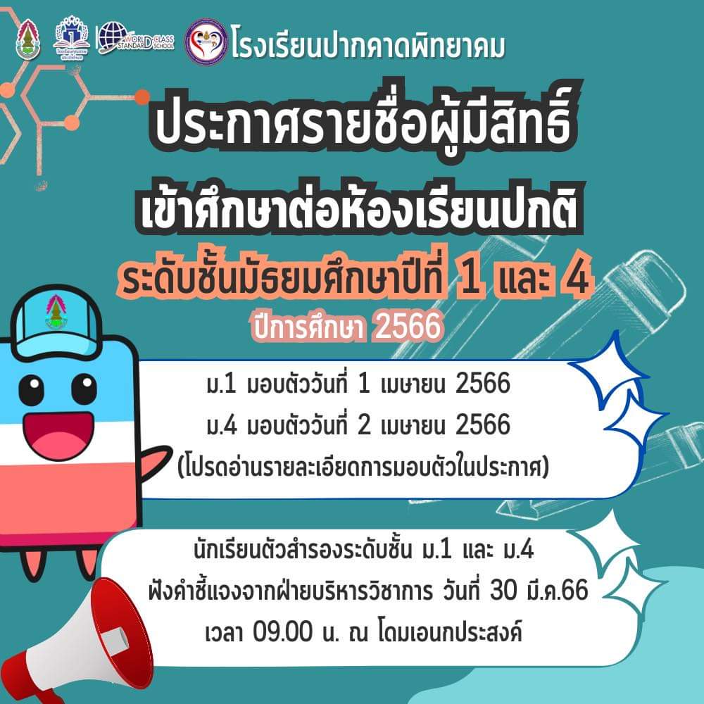 ผู้มีรายชื่อตัวสำรอง ให้มาฟังคำชี้แจงจากฝ่ายบริหารวิชาการ ในวันพฤหัสบดี ที่ 30 มีนาคม 2566 เวลา 09.00 น. ณ โดมเอนกประสงค์ โรงเรียนปากคาดพิทยาคม