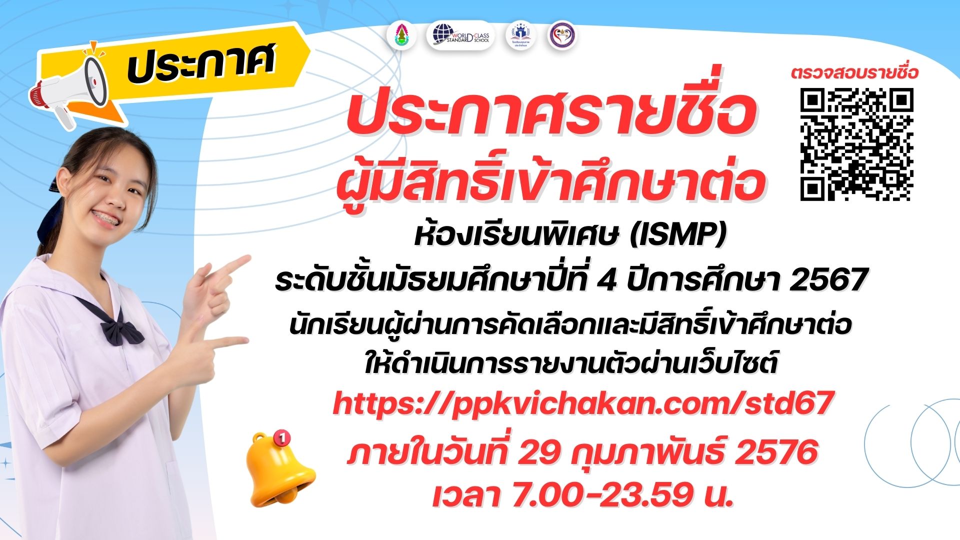 ประกาศรายชื่อผู้มีสิทธิ์เข้าศึกษาต่อห้องเรียนพิเศษ (ISMP) ระดับชั้นมัธยมศึกษาปีที่ 4 ปีการศึกษา 2567