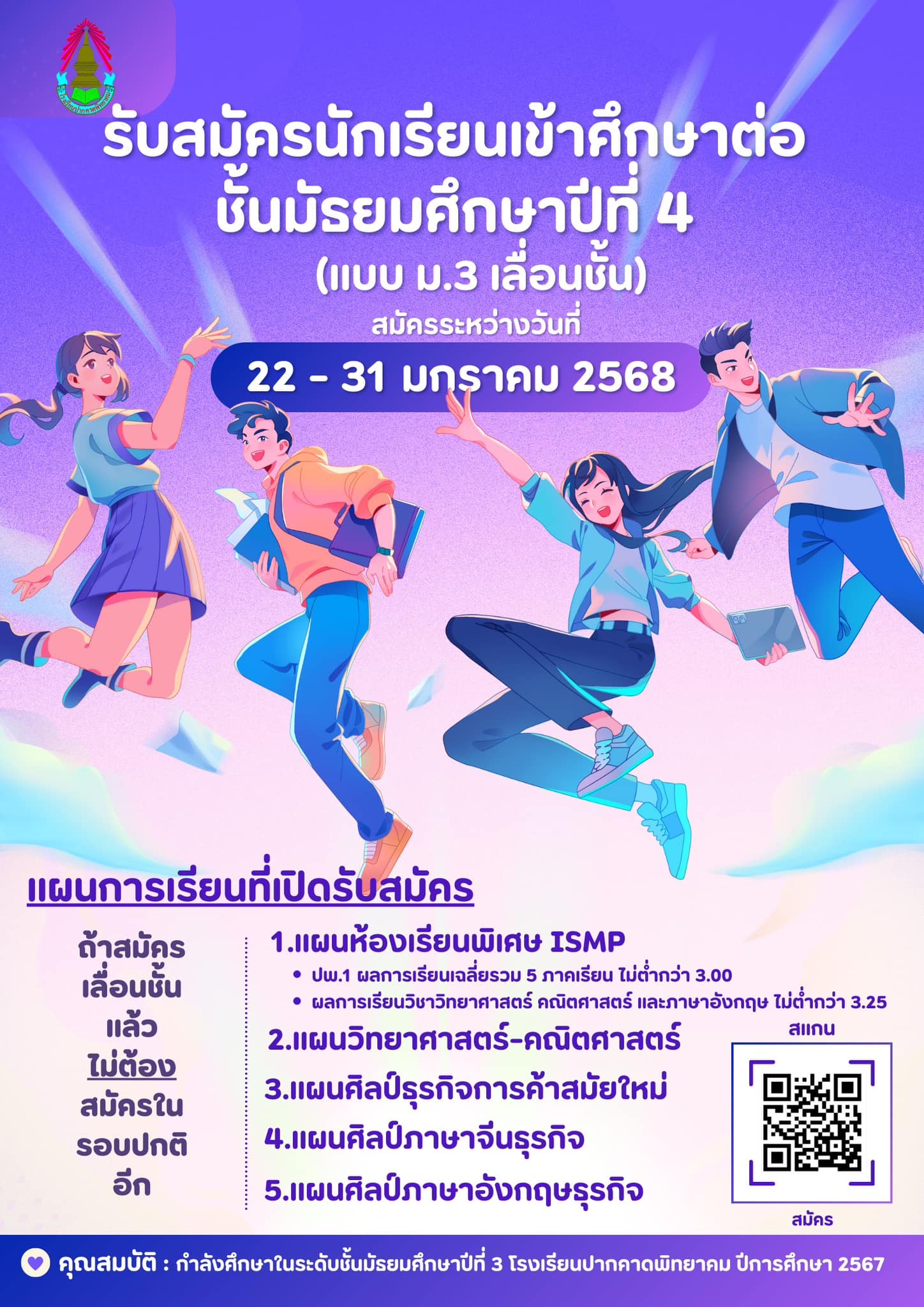 เปิดรับสมัครนักเรียนเข้าศึกษาต่อในระดับชั้นมัธยมศึกษาปีที่ 4 (แบบ ม.3 เลื่อนชั้น)
