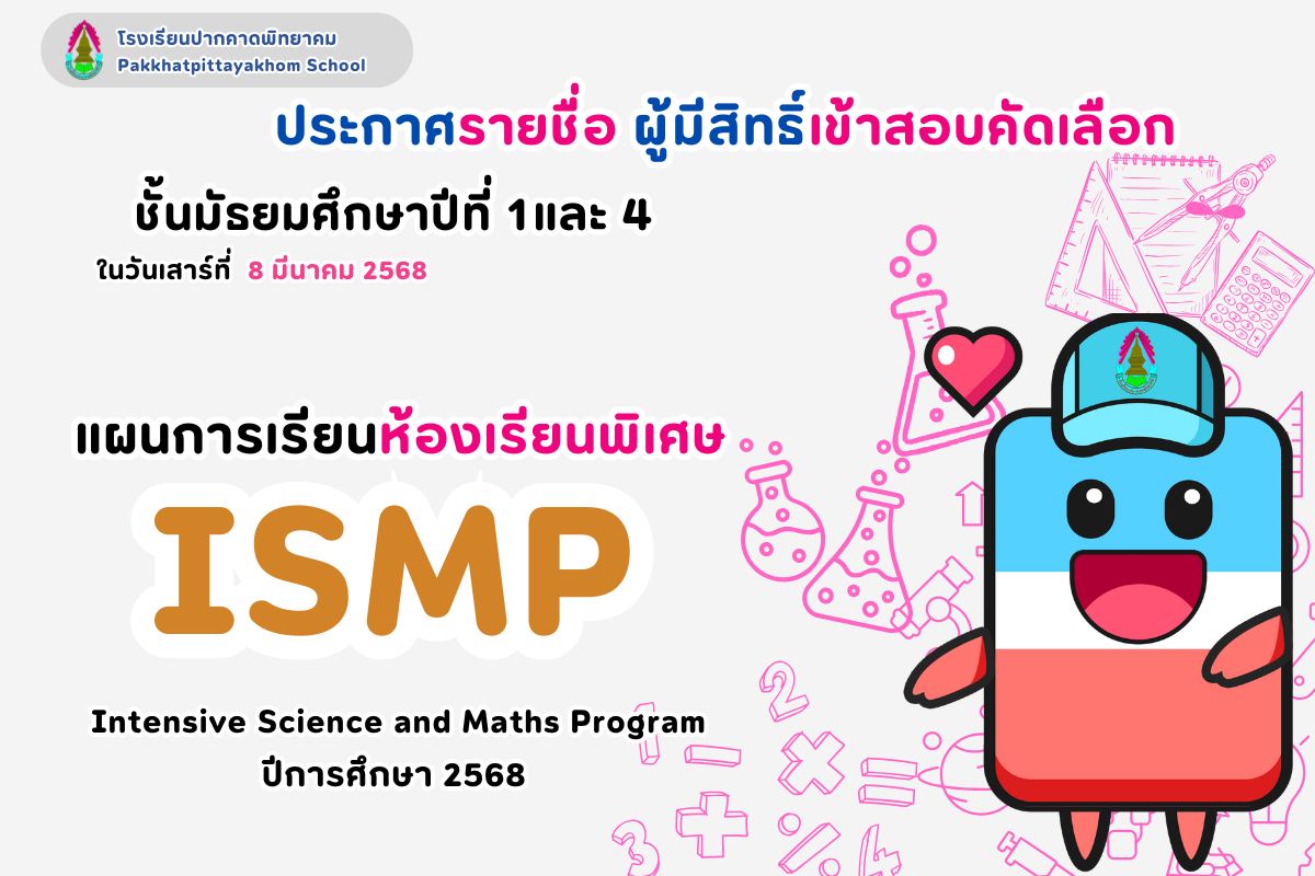 ประกาศรายชื่อนักเรียนผู้มีสิทธิ์เข้าสอบคัดเลือกเพื่อศึกษาต่อห้องเรียนพิเศษ (ISMP) ปีการศึกษา 2568 ระดับชั้นมัธยมศึกษาปีที่ 1 และ 4