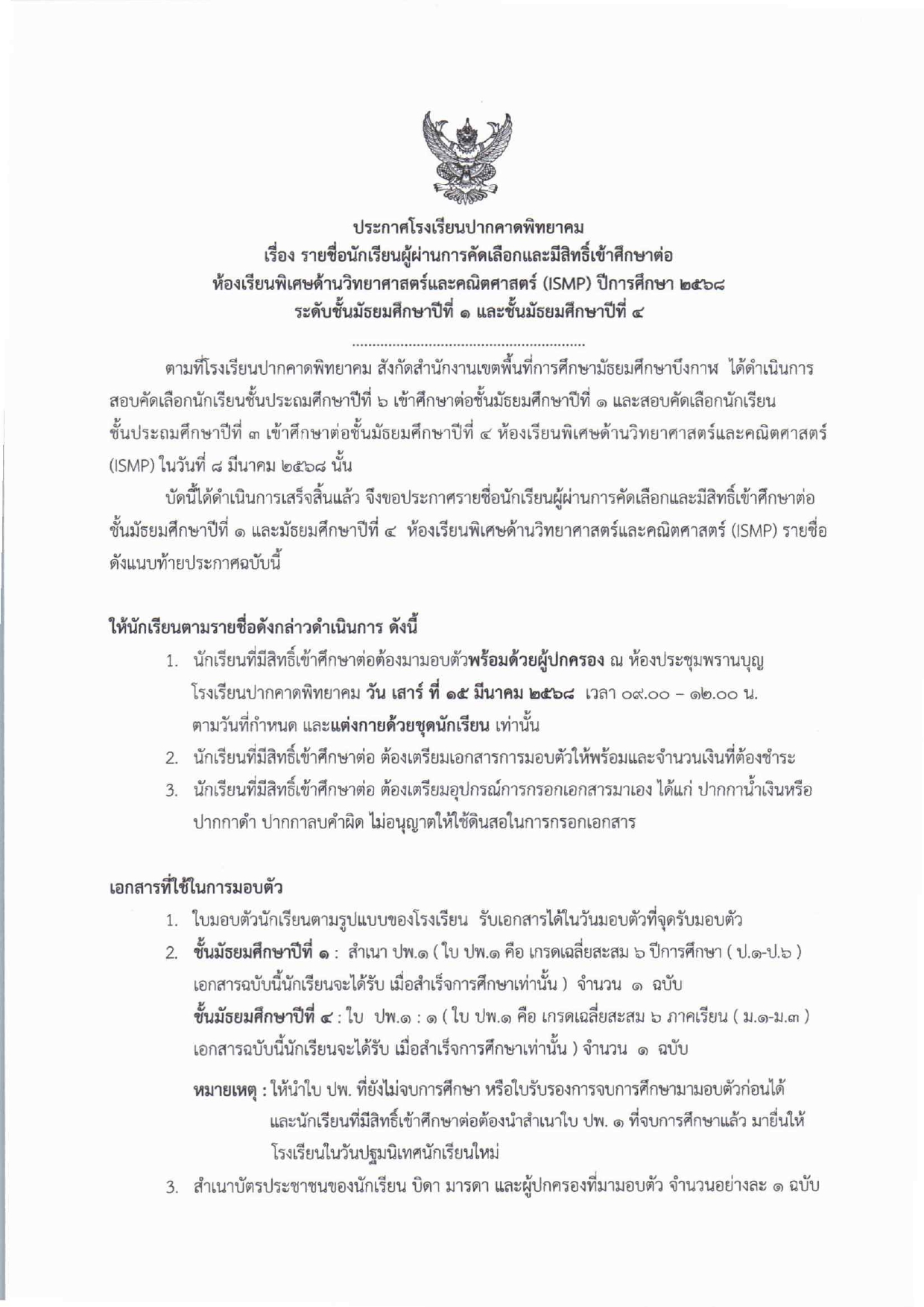 รายชื่อนักเรียนผู้ผ่านการคัดเลือกและมีสิทธิ์เข้าศึกษาต่อห้องเรียนพิเศษ (ISMP) ปีการศึกษา 2568 ระดับชั้นมัธยมศึกษาปีที่ 1 และ 4