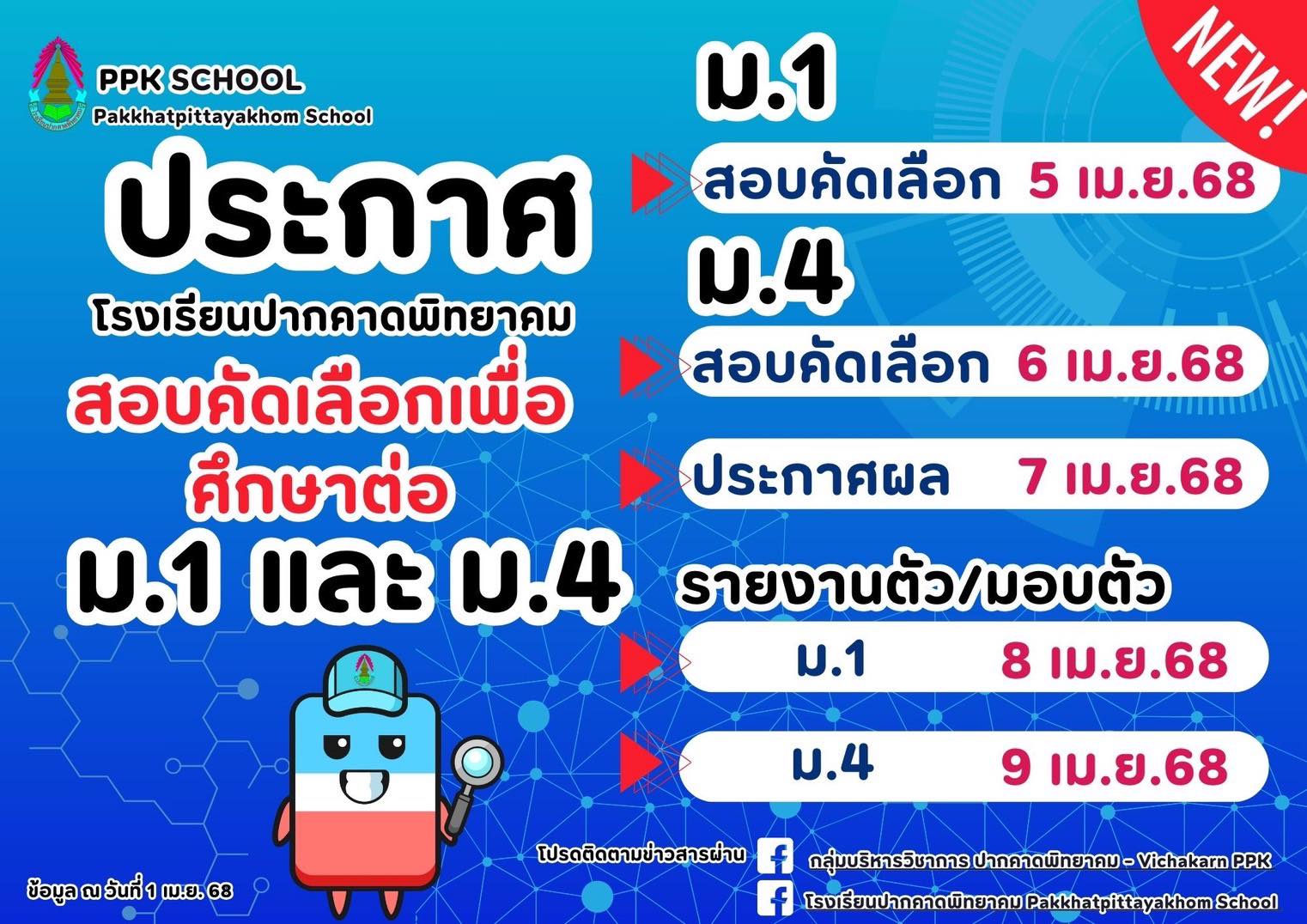 ???????? กำหนดการใหม่ สอบคัดเลือกเข้าเรียนชั้นมัธยมศึกษาปีที่ 1 และ 4 ปีการศึกษา 2568 ประเภทห้องเรียนปกติ โรงเรียนปากคาดพิทยาคม