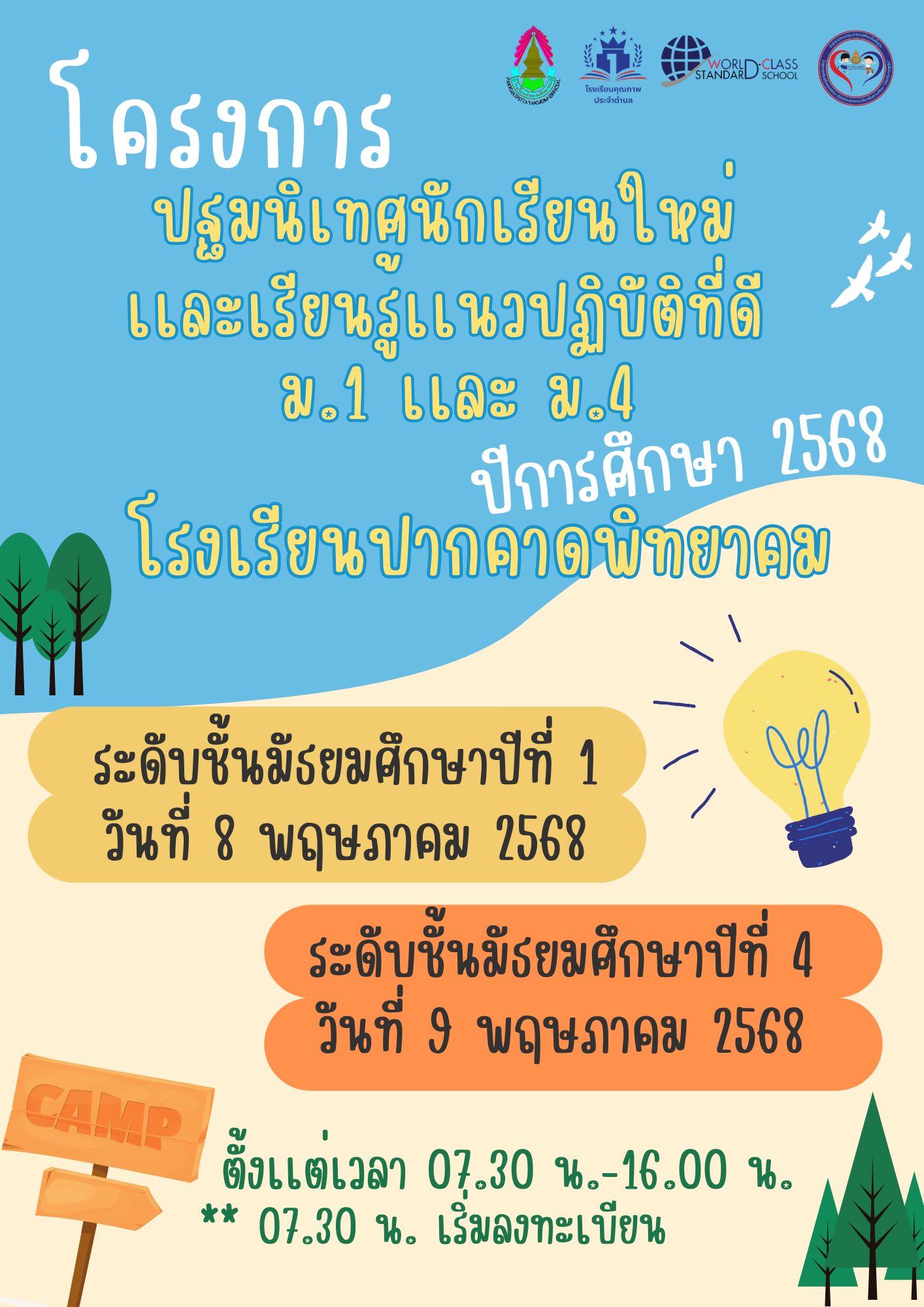 กำหนดการปฐมนิเทศนักเรียนใหม่ และเรียนรู้แนวปฏิบัติที่ดี ม.1 และ ม.4